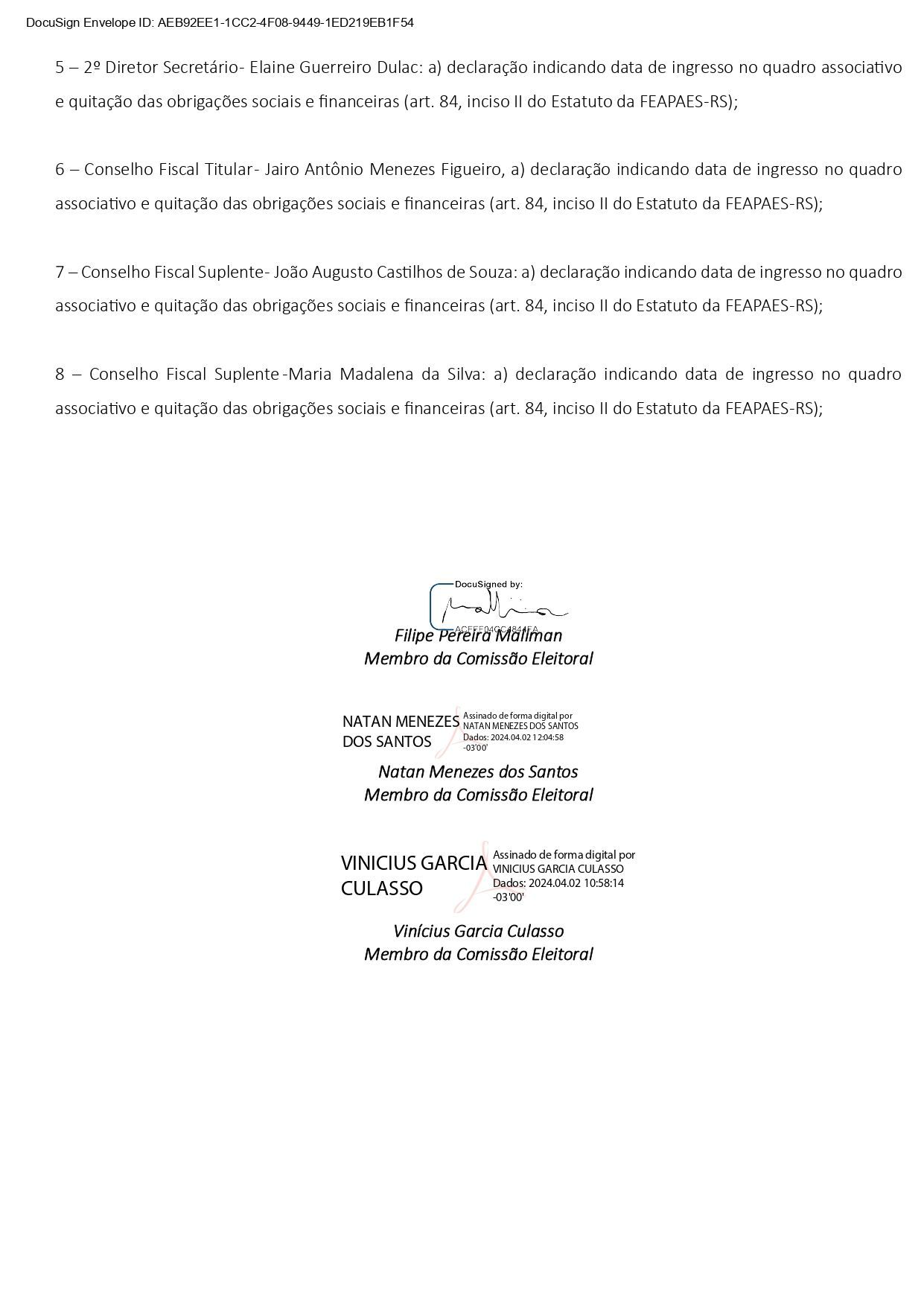 7 – Conselho Fiscal Suplente - João Augusto Castilhos de Souza: a) declaração indicando data de ingresso no quadro associativo e quitação das obrigações sociais e financeiras (art. 84, inciso II do Estatuto da FEAPAES-RS);