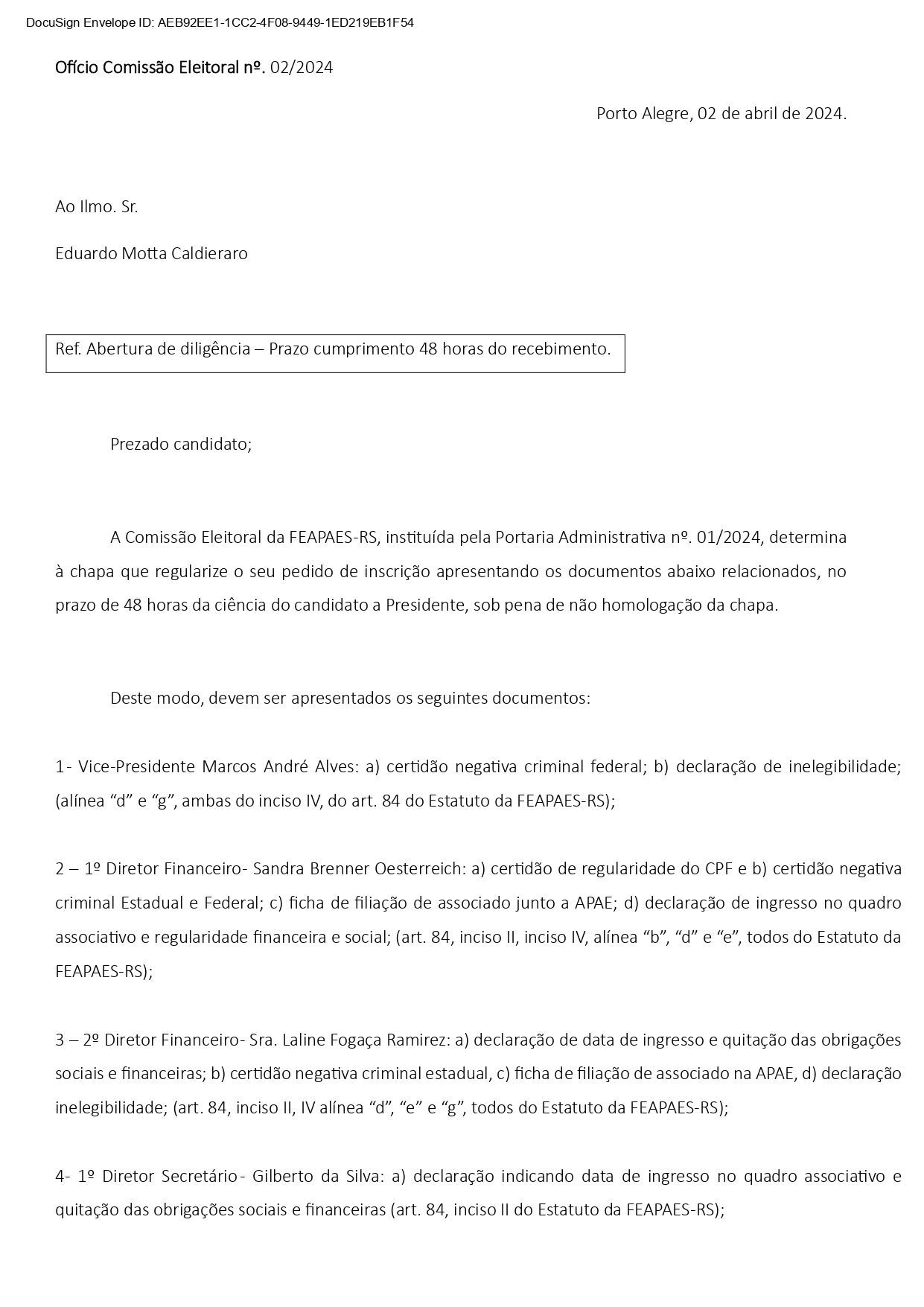 A Comissão Eleitoral da FEAPAES-RS, instituída pela Portaria Administrativa nº. 01/2024, determina à chapa que regularize o seu pedido de inscrição apresentando os documentos abaixo relacionados, no prazo de 48 horas da ciência do candidato a Presidente, sob pena de não homologação da chapa.
