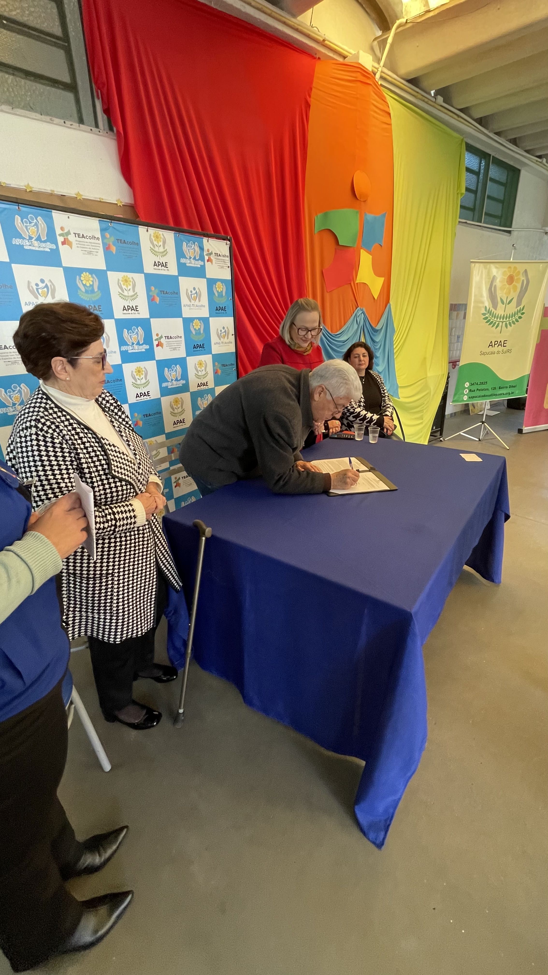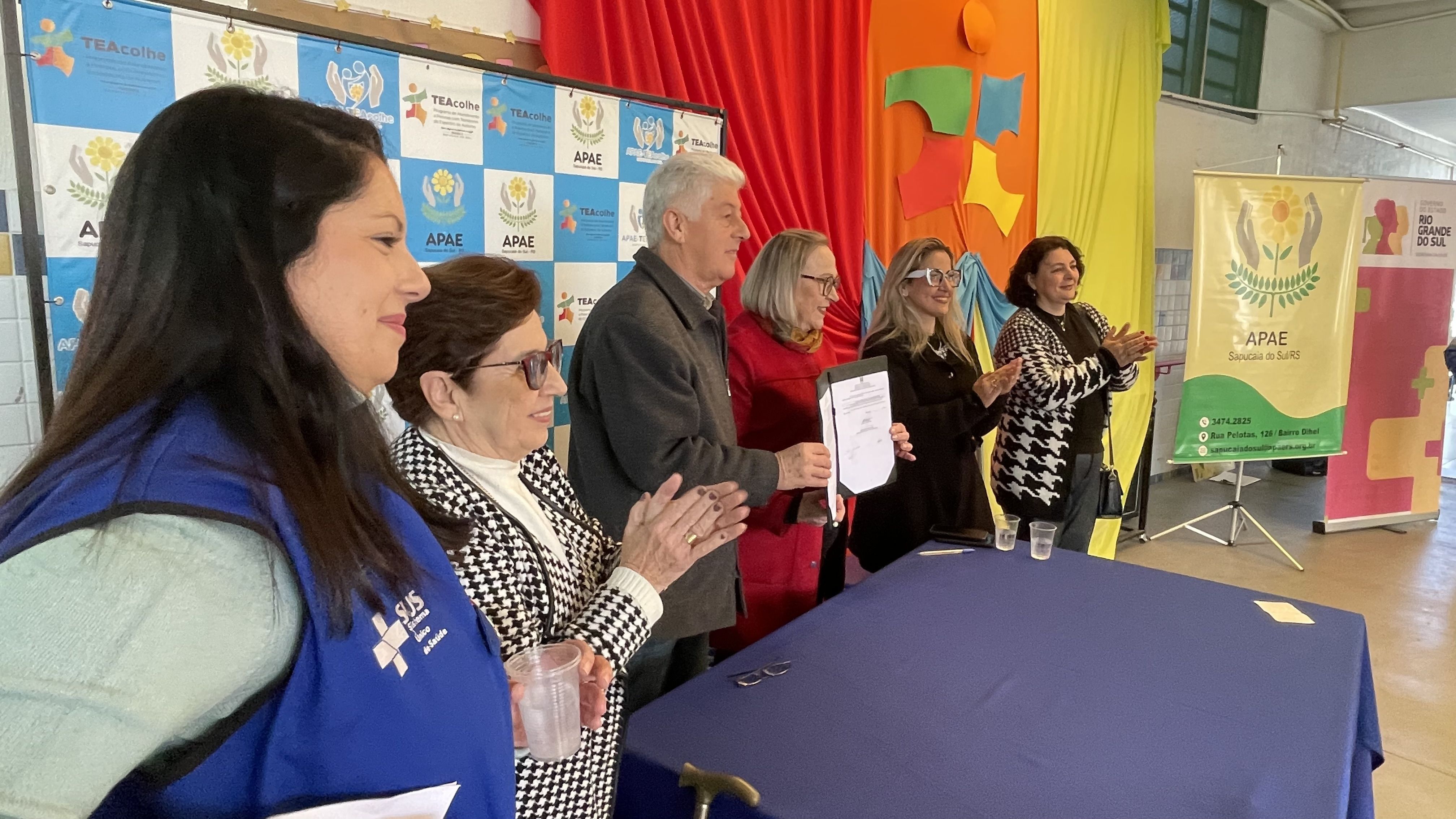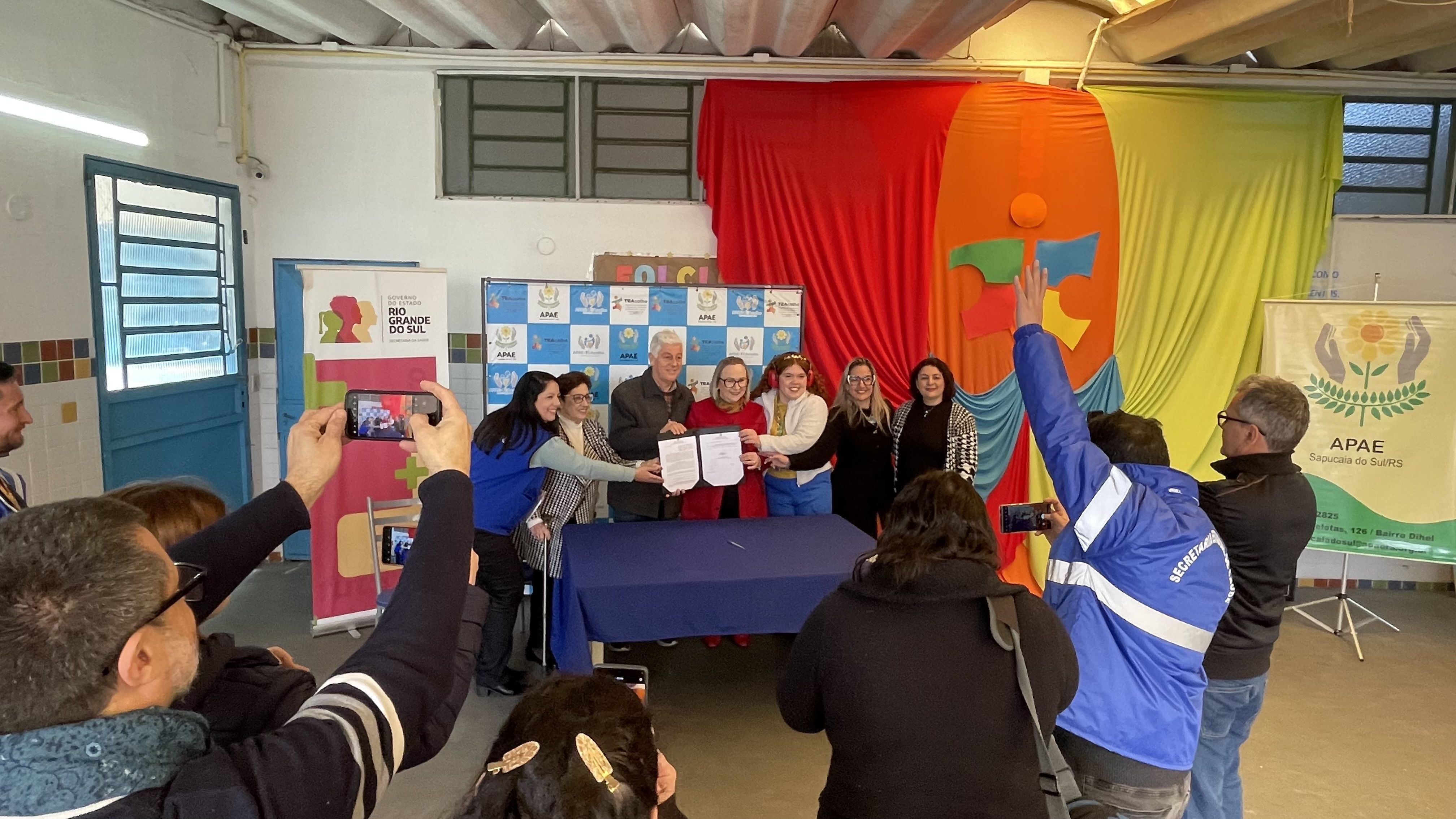 Para formalização do convênio, esteve presente a Secretária da Saúde do Estado Arita Bergmann e o Presidente da APAE Sapucaia do Sul Jose Garcia Kuhn. E representando a Prefeitura Municipal, a Secretaria Municipal Saúde Flávia Motta, a Coordenadora da 1ª Regional de Saúde do RS, Thais Schadeck e a Primeira-dama do Município Maria da Glória Rodrigues. Aracy destacou em sua fala que das 26 CAS/TEAcolhe, 19 funcionam nas Apaes do Rs, devido a excelência do trabalho realizado. Arita reforçou a fala de Aracy, dizendo que estava emocionada em estar ali mais uma vez constatando a qualidade do que é oferecido para as famílias. Também enfatizou que a política pública criada pelo governo do estado está comprometida em apoiar e atender as famílias atípicas da região.
