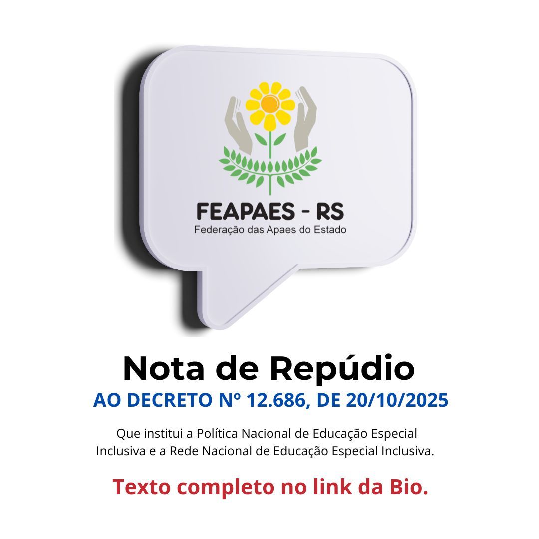 A Federação das APAEs do Estado do Rio Grande do Sul manifesta, por meio desta, sua profunda preocupação e convoca toda a comunidade Apaeana RS, incluindo entidades, profissionais e famílias engajadas na educação especial, a expressar seu veemente protesto contra o Decreto nº 12.686/2025, divulgado pelo Ministério da Educação, em 21 de outubro de 2025, que estabelece a Política Nacional de Educação Especial Inclusiva.