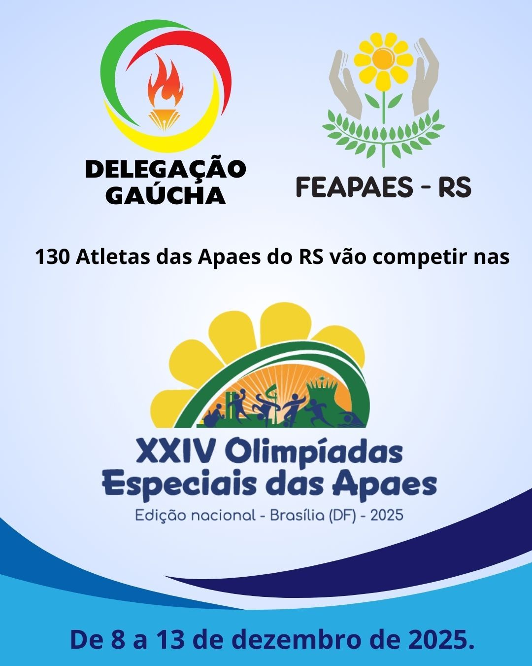O Rio Grande do Sul participa da XXIV Olimpíadas Especiais das Apaes, que ocorre de 8 a 13 de dezembro de 2025, em Brasília (DF), com uma delegação de 130 atletas de 23 municípios. Estarão representadas as cidades de Portão, Sapiranga, Ivoti, Dois Irmãos, Seberi, Tenente Portela, Frederico Westphalen, Santa Rosa, Santa Cruz do Sul, Rio Pardo, Cachoeira do Sul, Getúlio Vargas, Casca, Camaquã, Porto Alegre, Charqueadas, Butiá, Crissiumal, Três Coroas, Lajeado, Teutônia, Bom Retiro do Sul, Ajuricaba, Panambi e Passo Fundo.