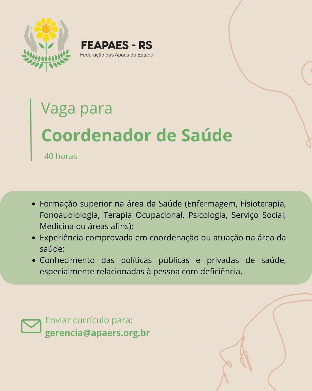 A Federação das APAEs do Estado do Rio Grande do Sul – FEAPAES/RS informa que está aberto o processo de contratação para a vaga de Coordenador(a) de Saúde