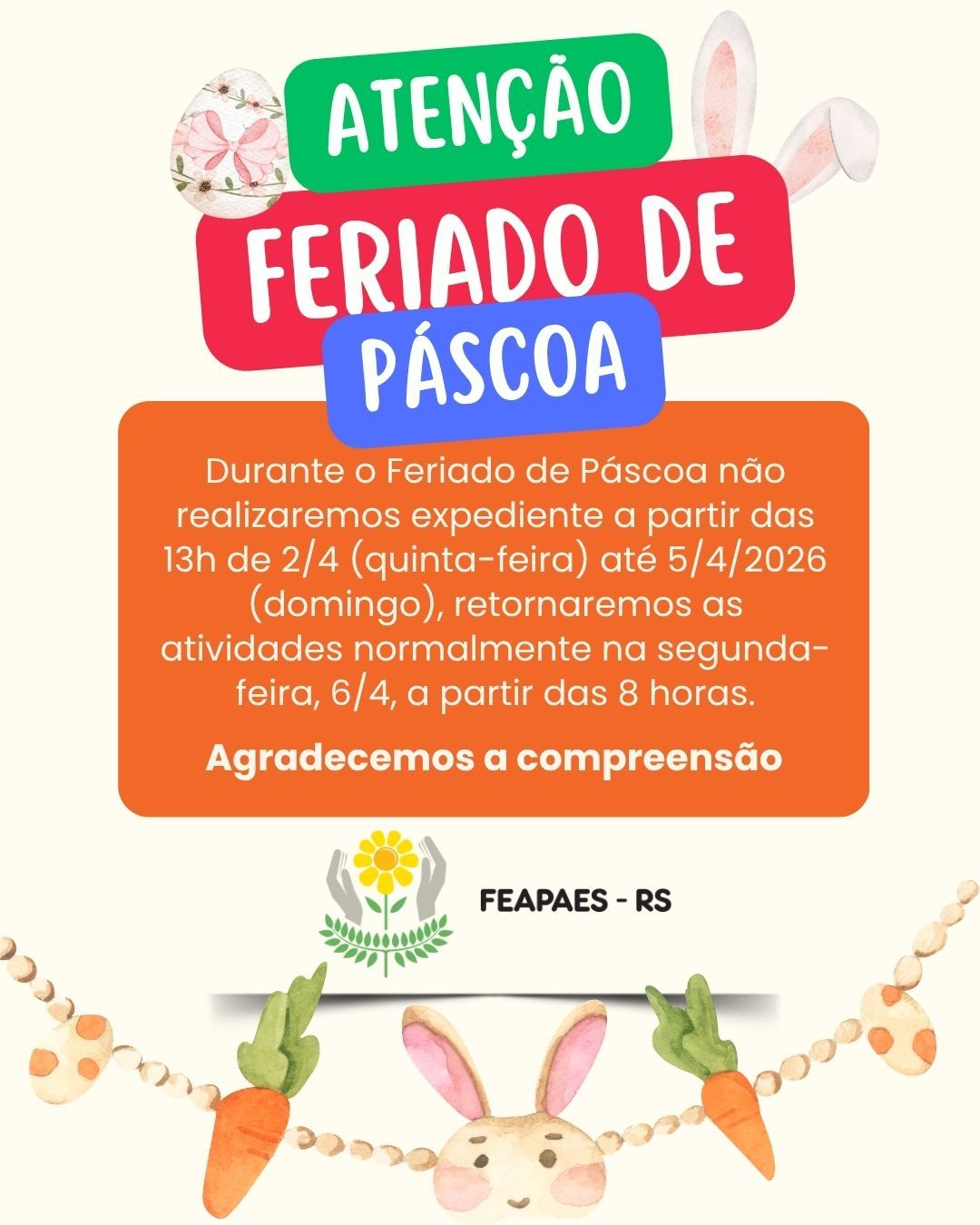 A Federação das Apaes do RS – Feapaes-RS realizará detetização nas instalações de sua sede na tarde de 2/4/2026, a partir das 13h, por essa razão não realizará atendimento ao público no período da tarde. Após o feriado de Páscoa, retornaremos as atividades normalmente na segunda-feira, 6/4, a partir das 8 horas.