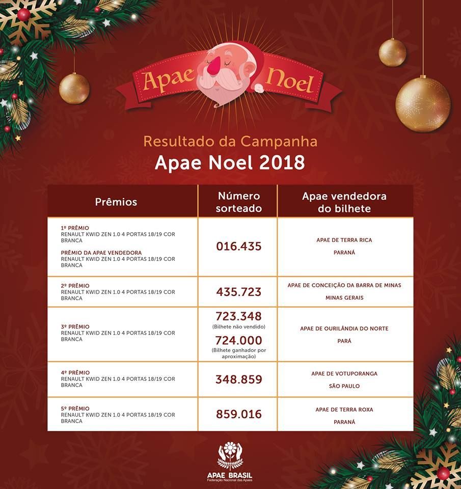 A Federação Nacional das Associações de Pais e Amigos dos Excepcionais (Fenapaes) divulgou o resultado da rifa Apae Noel 2018.