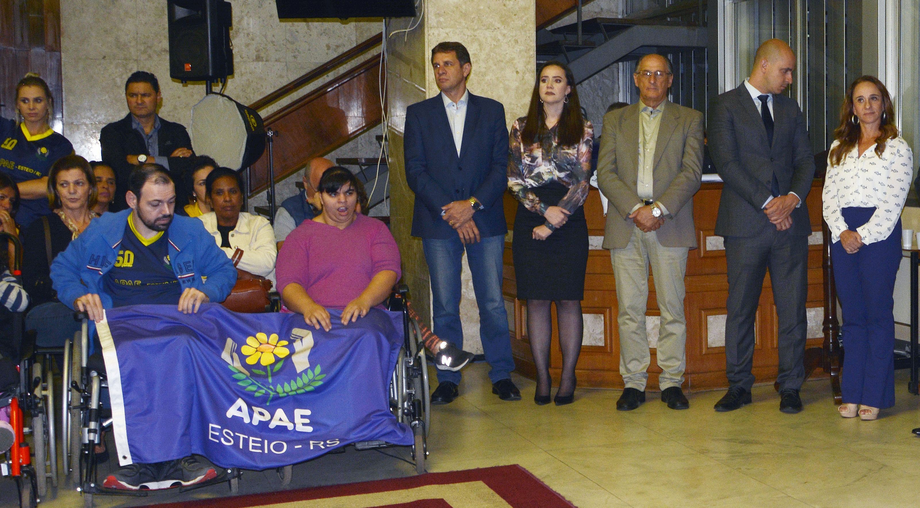 Entre os presentes, a APAE de Esteio trouxe seus atendidos e representantes que atuam nesta área. O Presidente da Federação das APAEs do Estado do Rio Grande do Sul, Sr. Afonso Tochetto também prestigiou a solenidade que lotou o Salão Júlio de Castilhos.