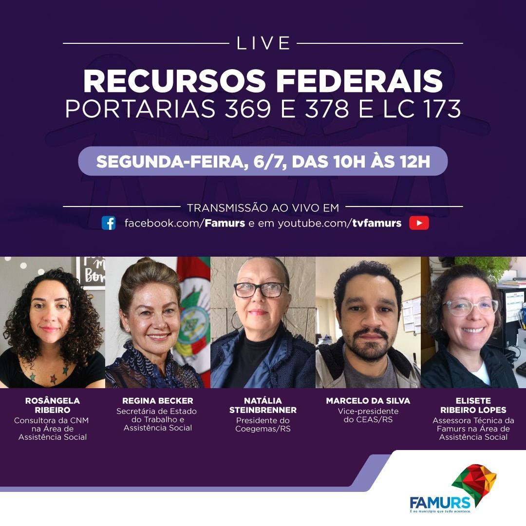 Nesta segunda-feira dia 06/07 às 10 horas o Coordenador de Assistencia Social da FEAPAES-RS, Marcelo Silva, participará juntamente com a Secretária Estadual do Tranbalho e Assistência Social, Regina Beker de reunião LIVE virtual transmitida ao vivo para tratar de assuntos referente a Recursos Federais das Portarias 369 e 378 e Lei Complementar 173.