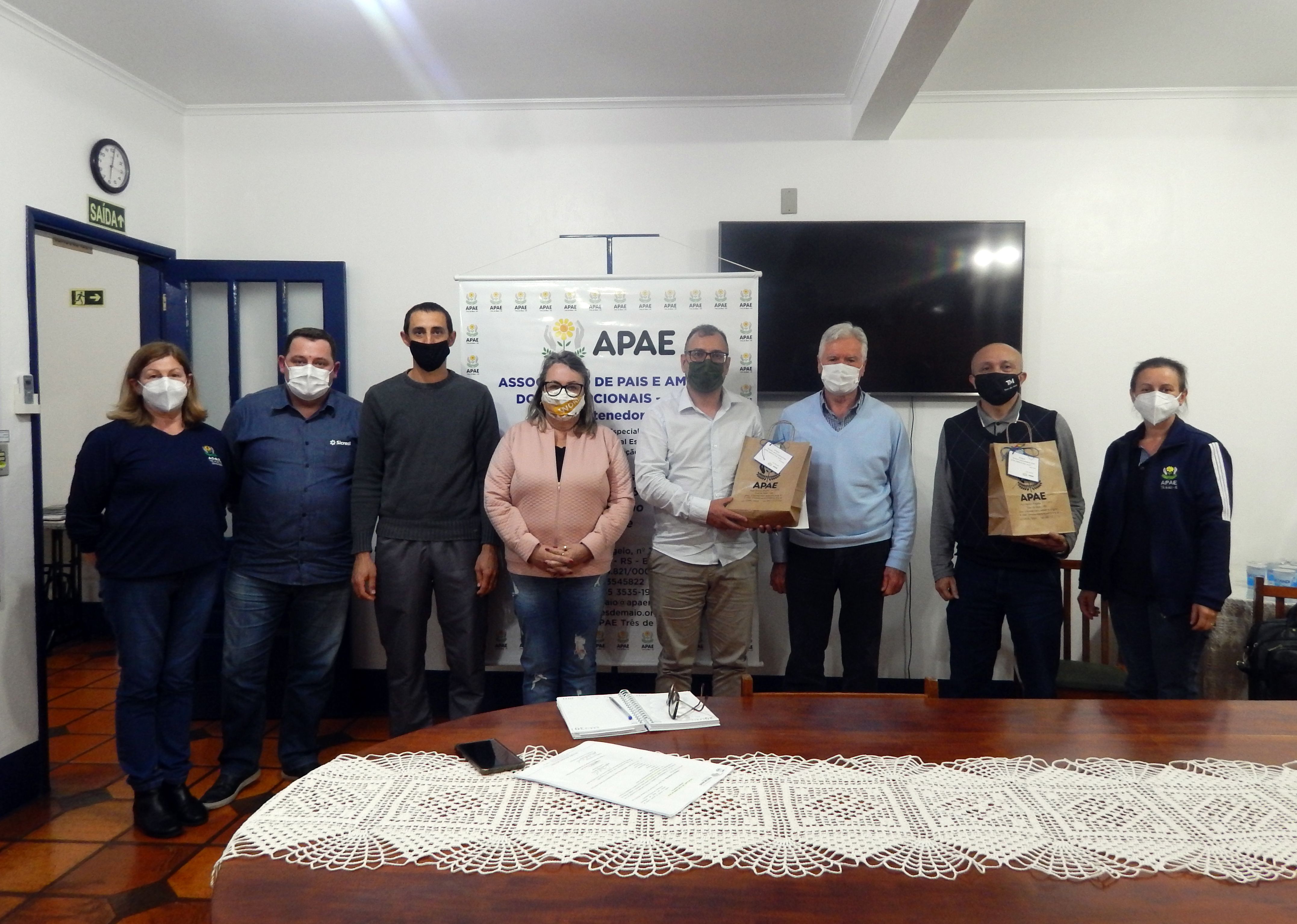 Participaram do encontro o Presidente da Apae Três de Maio, Vilson Gentil Foletto, as diretoras Nadir Gabe e Simone Rossi Tiecher, os pais dos alunos Marlene Sartor e Dirceu Gresele, que fazem parte da coordenadoria de famílias da instituição, e o pai do aluno e ex-presidente da Apae, Marcelo Silveira.