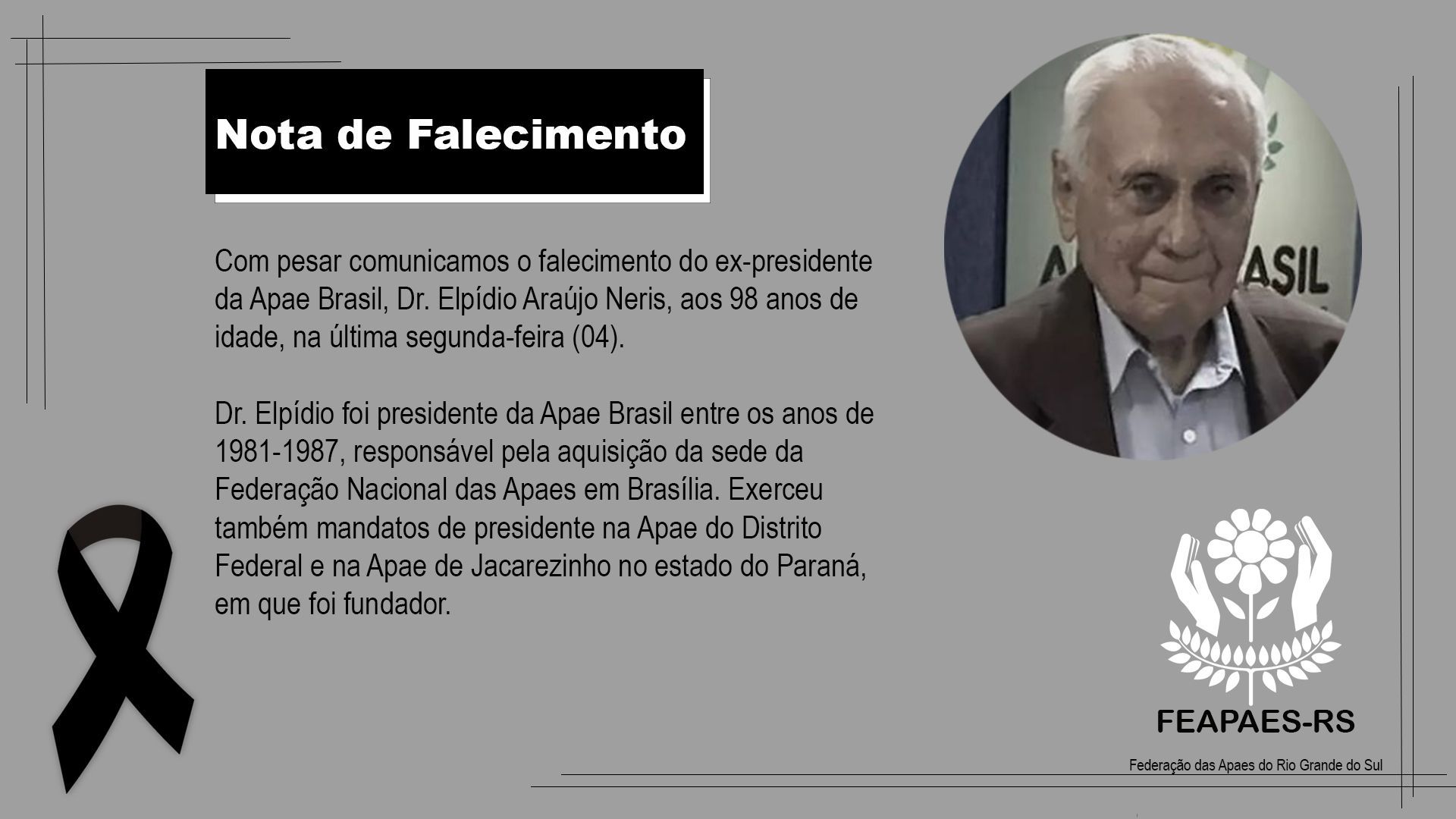 Com pesar comunicamos o falecimento do ex-presidente da Apae Brasil, Dr. Elpídio Araújo Neris, aos 98 anos de idade.