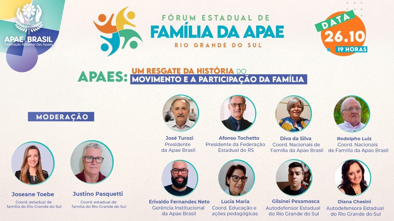O 1° Fórum Estadual de Família do Rio Grande do Sul está se aproximando e você é nosso convidado de honra. O evento acontecerá nos dias 26 e 28 de outubro. A transmissão acontecerá no youtube oficial da Apae Brasil a partir das 19h.