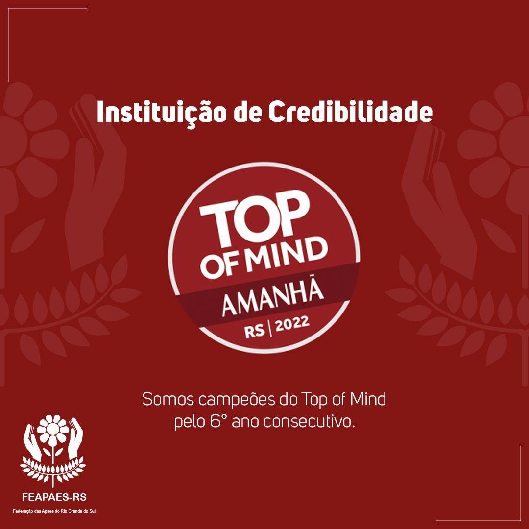 Pelo 6° ano consecutivo fomos n°1 no Top of Mind na área de Instituição de Credibilidade mais lembrada pelos Gaúchos. Entre OMS, AACD, BUTANTAN, UNICEF, a APAE ficou com o total de 19,7 entre as outras instituições.