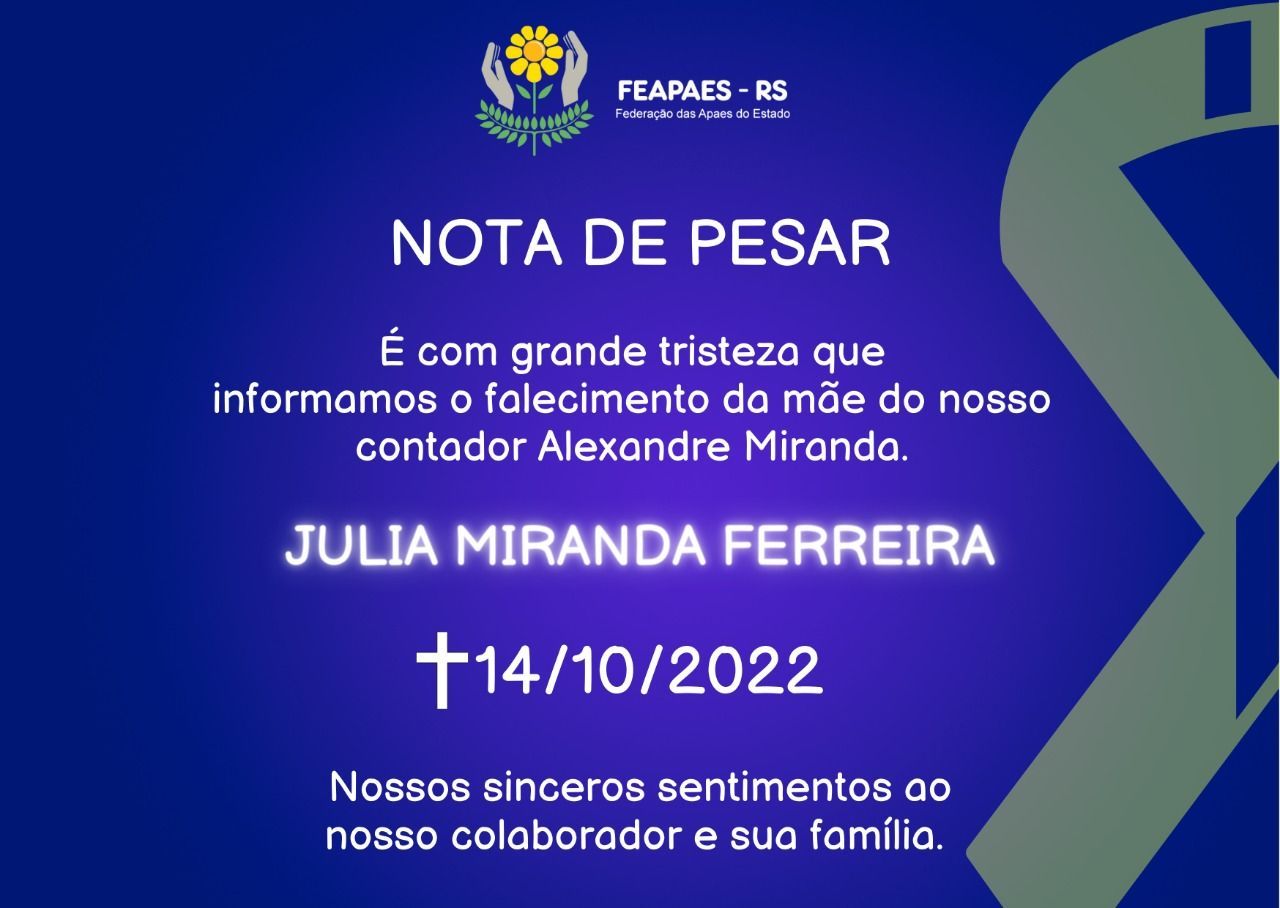 É com pesar que comunicamos o falecimento da mãe do nosso contador Alexandre Miranda. Oferecemos nossa solidariedade e sentimentos aos familiares.