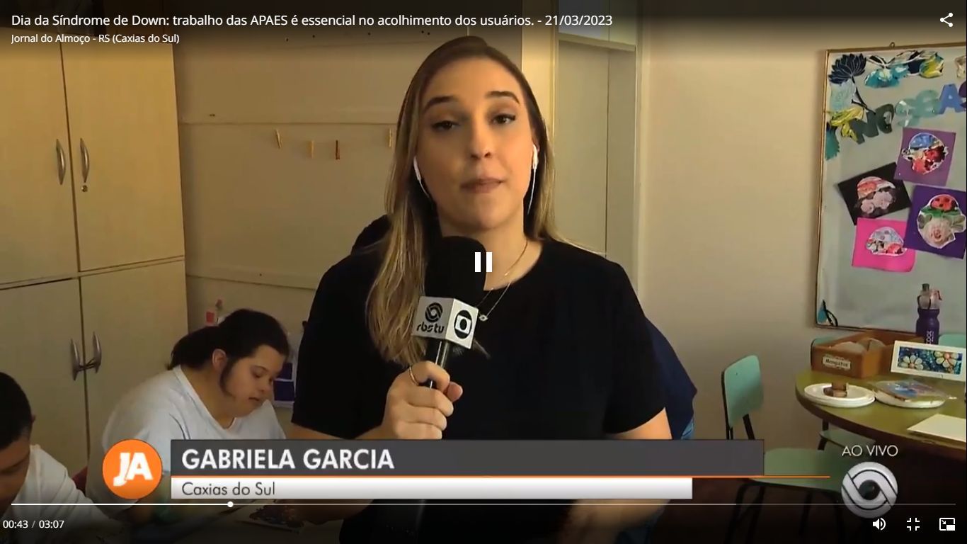 No dia 21 de março, marcando a passagem do Dia Internacional da Síndrome de Down, a equipe de reportagem do Jornal do Almoço esteve na Apae de Caxias do Sul mostrando o trabalho essencial desenvolvido pela intituição e a importância da participação da comunidade para que os serviços disponibilizados, de forma gratuita, sigam melhorando a qualidade de vida de seus atendidos.