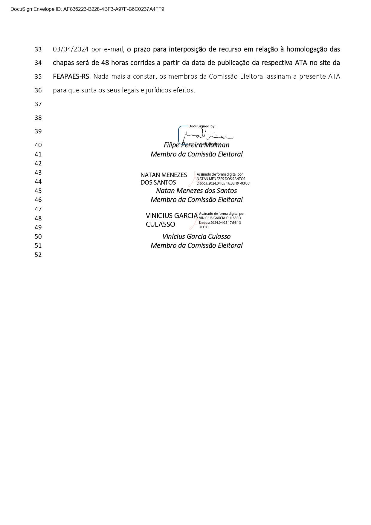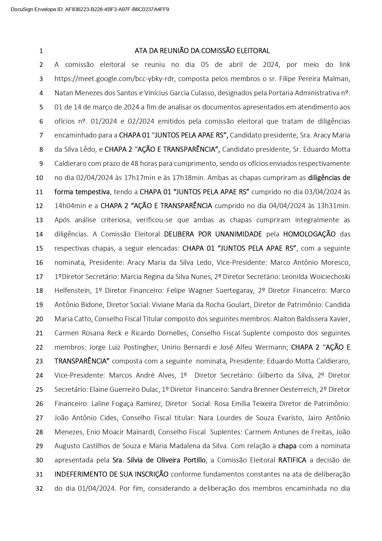 A comissão eleitoral se reuniu no dia 05 de abril de 2024, por meio do link https://meet.google.com/bcc-ybky-rdr, composta pelos membros o sr. Filipe Pereira Malman, Natan Menezes dos Santos e Vinícius Garcia Culasso, designados pela Portaria Administrativa nº. 01 de 14 de março de 2024 a fim de analisar os documentos apresentados em atendimento aos ofícios nº. 01/2024 e 02/2024 emitidos pela comissão eleitoral que tratam de diligências encaminhado para a CHAPA 01 “JUNTOS PELA APAE RS”, Candidato presidente, Sra. Aracy Maria da Silva Lêdo, e CHAPA 2 “AÇÃO E TRANSPARÊNCIA”, Candidato presidente, Sr. Eduardo Motta Caldieraro com prazo de 48 horas para cumprimento, sendo os ofícios enviados respectivamente no dia 02/04/2024 às 17h17min e às 17h18min. Ambas as chapas cumpriram as diligências de forma tempestiva, tendo a CHAPA 01 “JUNTOS PELA APAE RS” cumprido no dia 03/04/2024 às 14h04min e a CHAPA 2 “AÇÃO E TRANSPARÊNCIA cumprido no dia 04/04/2024 às 13h31min. Após análise criteriosa, verificou-se que ambas as chapas cumpriram integralmente as diligências. A Comissão Eleitoral DELIBERA POR UNANIMIDADE pela HOMOLOGAÇÃO das respectivas chapas, a seguir elencadas: CHAPA 01 “JUNTOS PELA APAE RS”, com a seguinte nominata, Presidente: Aracy Maria da Silva Ledo, Vice-Presidente: Marco Antônio Moresco, 1ºDiretor Secretário: Marcia Regina da Silva Nunes, 2º Diretor Secretário: Leonilda Woiciechoski Helfenstein, 1º Diretor Financeiro: Felipe Wagner Suertegaray, 2º Diretor Financeiro: Marco Antônio Bidone, Diretor Social: Viviane Maria da Rocha Goulart, Diretor de Patrimônio: Candida Maria Catto, Conselho Fiscal Titular composto dos seguintes membros: Alaiton Baldissera Xavier, Carmen Rosana Reck e Ricardo Dornelles, Conselho Fiscal Suplente composto dos seguintes membros: Jorge Luiz Postingher, Unirio Bernardi e José Alfeu Wermann; CHAPA 2 “AÇÃO E TRANSPARÊNCIA” composta com a seguinte nominata, Presidente: Eduardo Motta Caldieraro, Vice-Presidente: Marcos André Alves, 1º Diretor Secretário: Gilberto da Silva, 2º Diretor Secretário: Elaine Guerreiro Dulac, 1º Diretor Financeiro: Sandra Brenner Oesterreich, 2º Diretor Financeiro: Laline Fogaça Ramirez, Diretor Social: Rosa Emília Teixeira Diretor de Patrimônio: João Antônio Cides, Conselho Fiscal titular: Nara Lourdes de Souza Evaristo, Jairo Antônio Menezes, Enio Moacir Mainardi, Conselho Fiscal Suplentes: Carmem Antunes de Freitas, João Augusto Castilhos de Souza e Maria Madalena da Silva. Com relação a chapa com a nominata apresentada pela Sra. Silvia de Oliveira Portillo, a Comissão Eleitoral RATIFICA a decisão de INDEFERIMENTO DE SUA INSCRIÇÃO conforme fundamentos constantes na ata de deliberação do dia 01/04/2024. Por fim, considerando a deliberação dos membros encaminhada no dia 03/04/2024 por e-mail, o prazo para interposição de recurso em relação à homologação das chapas será de 48 horas corridas a partir da data de publicação da respectiva ATA no site da FEAPAES-RS. Nada mais a constar, os membros da Comissão Eleitoral assinam a presente ATA para que surta os seus legais e jurídicos efeitos.
