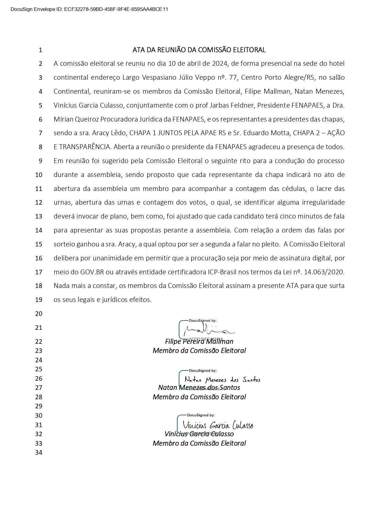 A comissão eleitoral se reuniu no dia 10 de abril de 2024, de forma presencial na sede do hotel continental endereço Largo Vespasiano Júlio Veppo nº. 77, Centro Porto Alegre/RS, no salão Continental, reuniram-se os membros da Comissão Eleitoral, Filipe Mallman, Natan Menezes, Vinícius Garcia Culasso, conjuntamente com o prof Jarbas Feldner, Presidente FENAPAES, a Dra. Mírian Queiroz Procuradora Jurídica da FENAPAES, e os representantes a presidentes das chapas, sendo a sra. Aracy Lêdo, CHAPA 1 JUNTOS PELA APAE RS e Sr. Eduardo Motta, CHAPA 2 – AÇÃO E TRANSPARÊNCIA. Aberta a reunião o presidente da FENAPAES agradeceu a presença de todos. Em reunião foi sugerido pela Comissão Eleitoral o seguinte rito para a condução do processo durante a assembleia, sendo proposto que cada representante da chapa indicará no ato de abertura da assembleia um membro para acompanhar a contagem das cédulas, o lacre das urnas, abertura das urnas e contagem dos votos, o qual, se identificar alguma irregularidade deverá invocar de plano, bem como, foi ajustado que cada candidato terá cinco minutos de fala para apresentar as suas propostas perante a assembleia. Com relação a ordem das falas por sorteio ganhou a sra. Aracy, a qual optou por ser a segunda a falar no pleito. A Comissão Eleitoral delibera por unanimidade em permitir que a procuração seja por meio de assinatura digital, por meio do GOV.BR ou através entidade certificadora ICP-Brasil nos termos da Lei nº. 14.063/2020. Nada mais a constar, os membros da Comissão Eleitoral assinam a presente ATA para que surta os seus legais e jurídicos efeitos.
