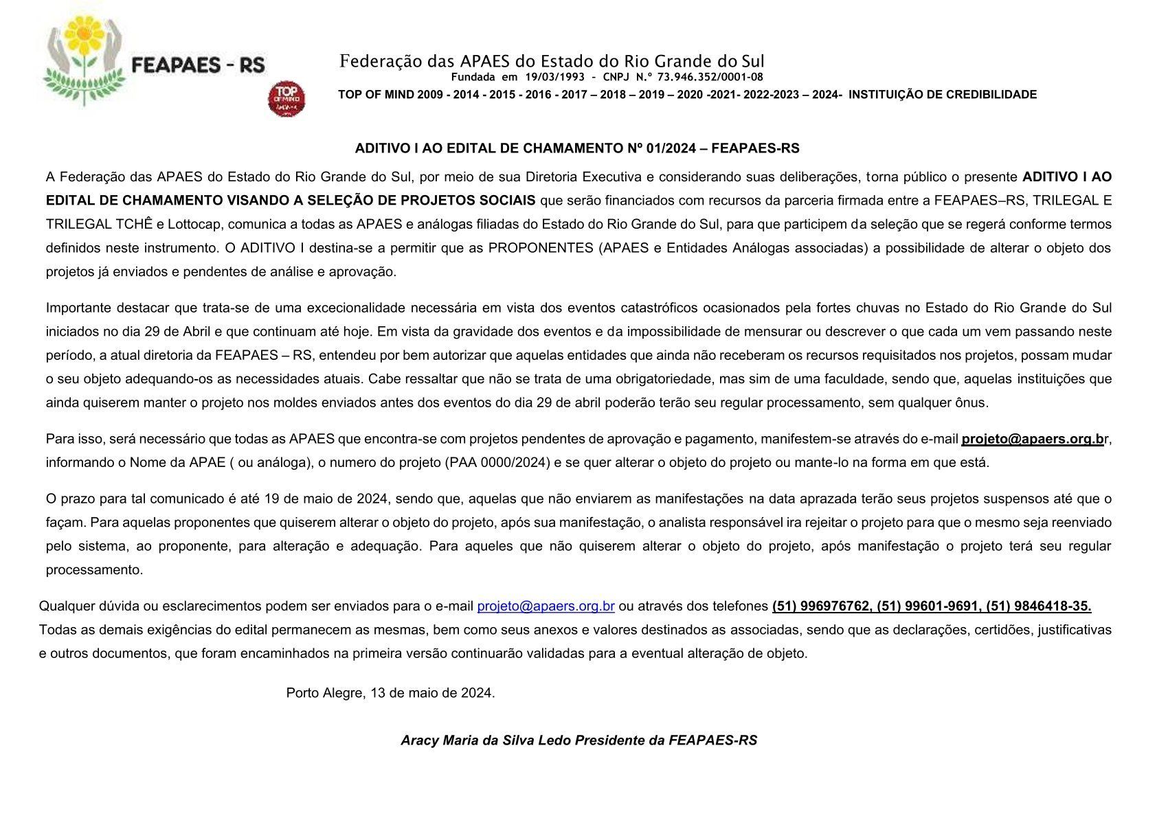 Importante destacar que trata-se de uma excecionalidade necessária em vista dos eventos catastróficos ocasionados pela fortes chuvas no Estado do Rio Grande do Sul iniciados no dia 29 de Abril e que continuam até hoje. Em vista da gravidade dos eventos e da impossibilidade de mensurar ou descrever o que cada um vem passando neste período, a atual diretoria da FEAPAES – RS, entendeu por bem autorizar que aquelas entidades que ainda não receberam os recursos requisitados nos projetos, possam mudar o seu objeto adequando-os as necessidades atuais. Cabe ressaltar que não se trata de uma obrigatoriedade, mas sim de uma faculdade, sendo que, aquelas instituições que ainda quiserem manter o projeto nos moldes enviados antes dos eventos do dia 29 de abril poderão terão seu regular processamento, sem qualquer ônus.