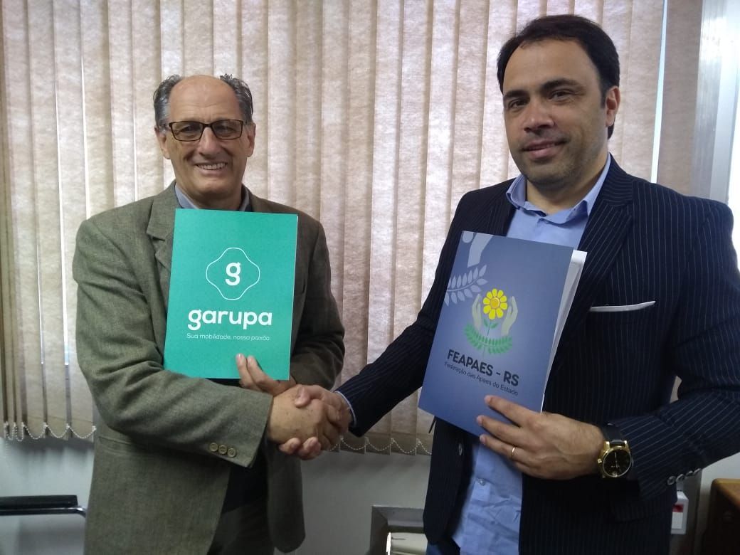 A Federação das APAES do Estado do Rio Grande do Sul, representada por seu Presidente Sr. Afonso Tochetto celebrou na data de ontem a parceria com o aplicativo de mobilidade urbana Garupa, representado por seu CEO Marcondes Trindade. A Parceria objetiva a angariação de recursos para o custeio de projetos sociais em prol das APAEs do Estado, na qual será oportunizado no aplicativo a opção de que os clientes realizem doação de R$ 0,50 (cinquenta centavos) enquanto aguardam a chegada do veículo.