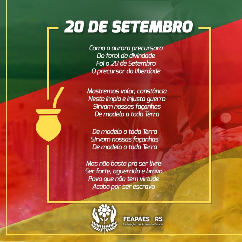 Os gaúchos são especiais, temos orgulho de ser gaúchos de ser do Rio Grande do Sul e de ser APAEANOS!No céu azul e no verde dos pampas, no calor da cultura, forjamos o Rio Grande do Sul. Na emoção de gerações e no cultivo de ser gaúcho. Neste 20 de setembro, a nossa homenagem é registrada: sirvam nossas façanhas, de modelo a toda Terra!