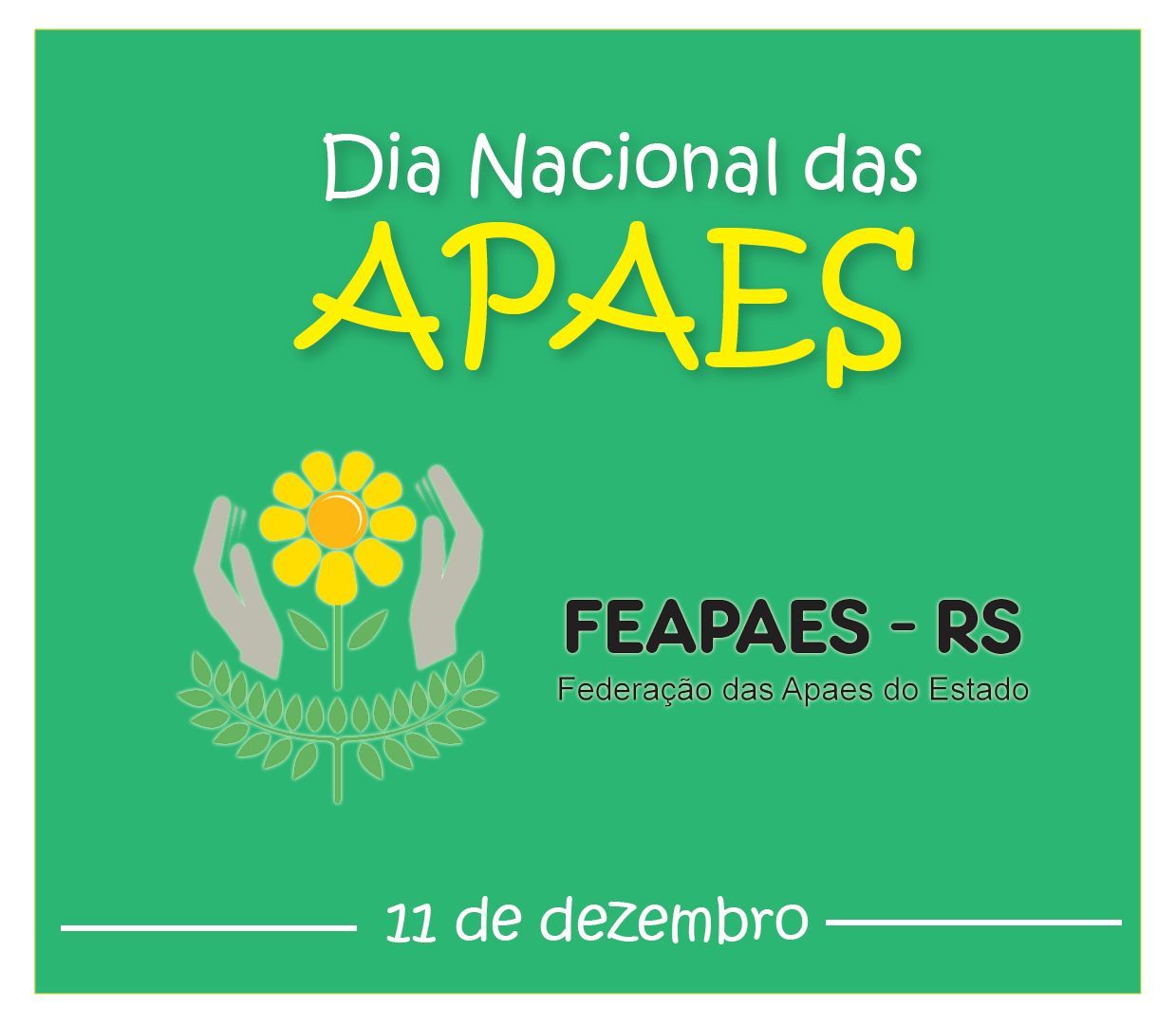 Nessa terça-feira, 11 de dezembro, é comemorada a data mais importante para o movimento apaeano, o Dia Nacional das APAES. A data foi criada em 2001, em referência à fundação da primeira APAE no país.A Federação das Apaes do Estado do Rio Grande do Sul parabeniza as mais de duas mil e cem Apaes distribuídas em todo o País, que propiciam atenção integral a cerca de 250.000 pessoas com deficiência!